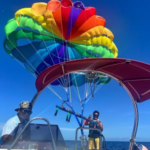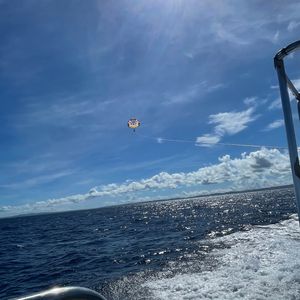 パラセーリングをする場所まで船で音楽聴きながら猛スピードで走って乗ってるだけでもう楽しかった!!一緒のグループの人たちと写真や動画を取り合ったりしました。お兄さんとお姉さんに希望すると、高さを調節しながら海の水面ギリギリまで下げてくれたり面白かった!1番高い位置からの景色は爽快で景色がめちゃくちゃ良かったです♪濡れることまあるので、濡れてもいいTシャツと水着のズボンで参加して良かったです!集合場所は、駐車場に車を止めて、港の入り口を入ってすぐの正面。海に沿って、船が沢山停めてあるところにお姉さんが立ってくれていました。(港の入り口入ってすぐの待合室の看板の方に進まないように)