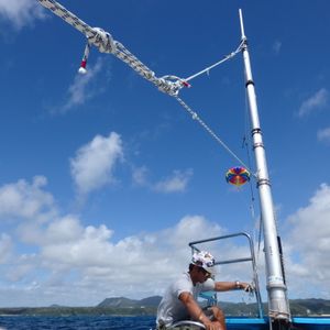 沖合についたら、ひとりずつ船の後ろの高くなっているところにいって、パラセールに先ほど準備で装着したヒモを取り付けてもらいます。これで、空中ブランコのような形になります。
