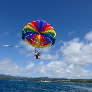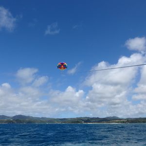 予想外の渋滞で到着時間が少し遅れると伝えたところ、親切に対応して頂きとても助かりました。ありがとうございます。到着してから簡単なアンケーと必要事項を書き、そのあとスタッフさんの車を筆頭に自分たちの車で港まで移動しました。そこからボートで海へ行き、2人×3組で交代でパラセーリングが始まりました。最初身体が浮く時に少し恐怖心はありましたが、特に揺れなどはなかったのでその後はもう怖さはなく終始大興奮でした!!!海に浮かぶ空中ブランコみたいで、沖縄の綺麗な海が一望でき、最高の景色でした!飛んだら手足は自由に動かしていいと言われたので、好き放題に動かしてました(笑)カメラも持ち込みOK(何かあったら自己責任なので注意です)でなかなか撮れない素敵な写真が撮れたので最高でした!2人とも絶叫が大好きだったので、高いところまで伸ばしてくれて、とても満足でした!今回初めてパラセーリングを体験しましたが、ツアーの方がわかりやすく説明してくれたので安心して楽しめました。最高の思い出になりました!ありがとうございました♪♪
