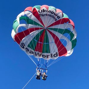 沖縄の青い海と空の中、飛ぶことができるのは特別の体験!