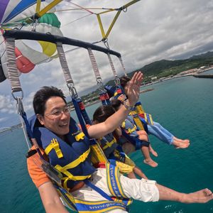 台風の影響が心配でしたが、無事パラセーリングに出発できました。気持ちいい海風で、ボートは波をかき分けポイントに到着。的確な指示であっと言う間に空の旅へ。波を怖がっていた子供も「気持ちいい〜」とご機嫌でした。本当に鳥になった気分になりました。