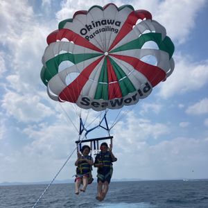 2週間前の沖縄旅行で一番楽しみだったパラセーリング。宿泊先の那覇ホテルから予想以上に時間がかかり、おまけに集合場所がカーナビに表示されない。。。プチパニックに陥っていた最中にスタッフの方からお電話をいただき、かろうじて5分前にギリギリ間に合いました。ご迷惑をおかけし、申し訳ありませんでした。海上高く舞う?パラセーリングは楽しみと恐さ?が入り混じったものでしたが、いざ飛んでみますと快適なお空の散歩でした。GoProも無料で貸していただき、夫が撮った画像はとても良い思い出になりました。11年前に東南アジア某国で体験したときはオンボロの船で沈没しそうでしたし、肝心のパラセーリングもとてもこわかった!という記憶しか残っていないのですが。。。「パラセーロングは絶対に沖縄でやるべきよ!」と子供達にラインしました。来年も沖縄へ行きたいです。ご親切なスッタフの方々、本当にありがとうございました。