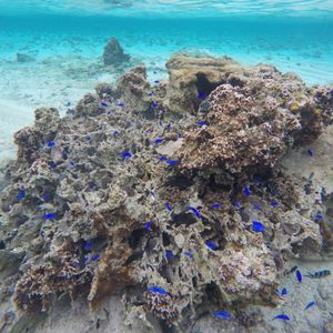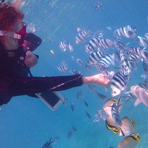 魚に餌をあげと予想よりも多くの魚がよってきて、ビックリでした。あまりのビックリさに思わず海水を、少し飲んでしまったけど、潜る前にマスクに海水が入ったときの対応方法を聞いていたので、冷静に対応することが出来てよかったです。
