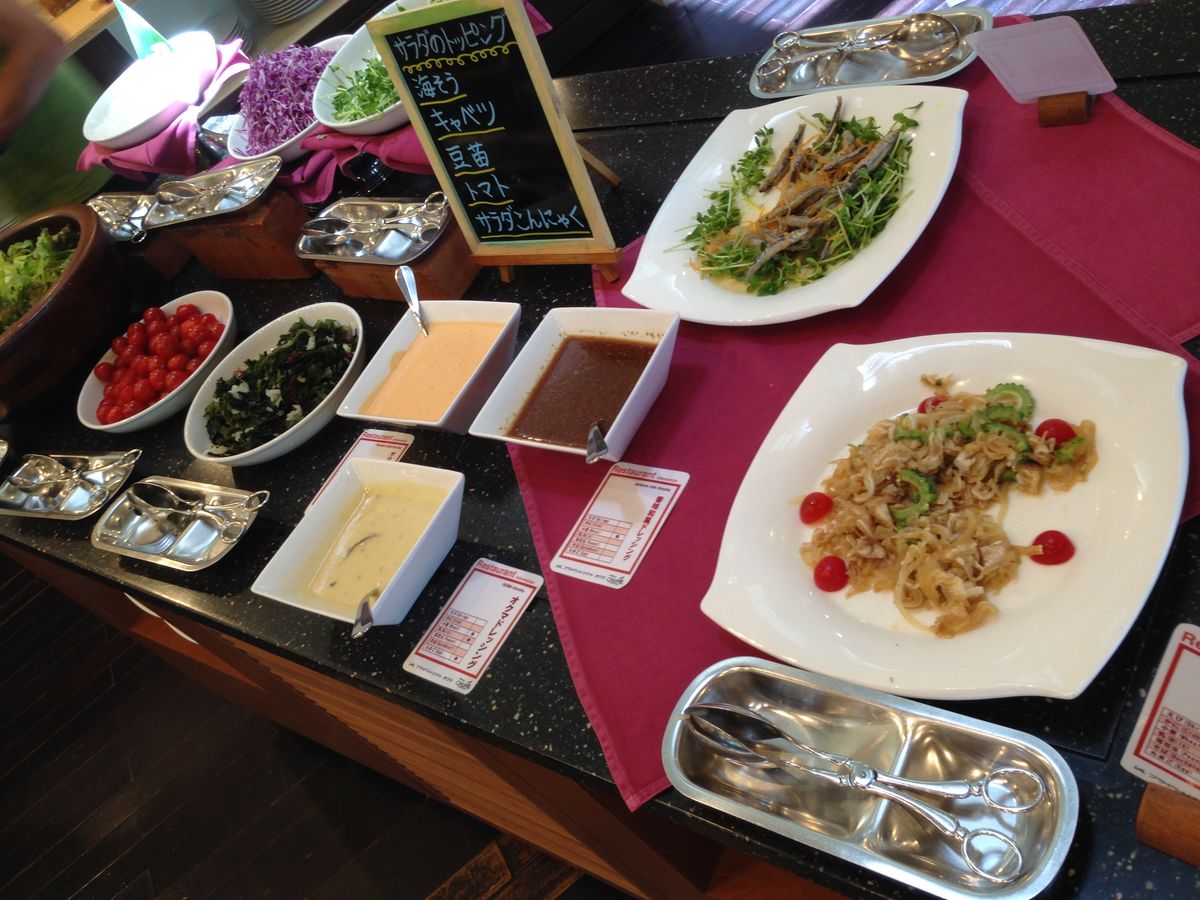 ハイキングを終えた後は、しばし南下をしてJALプライベートリゾートオクマへ向かいます。このリゾートホテルの敷地内にある天井の高い、実に広々としたレストランでブッフェスタイルの昼食を食べます。沖縄そばからミミガーまで様々な料理があり、こちらも楽しい充実した食事となりました。