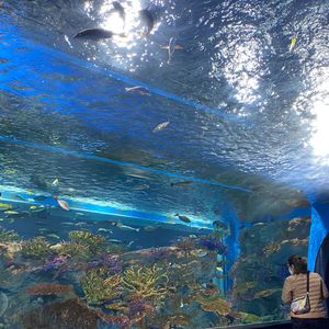 大きな水槽にジンベイザメやエイなど優雅に泳いでいました。それを見ながらのカフェがありカップルなら最高のスポットになると思います。