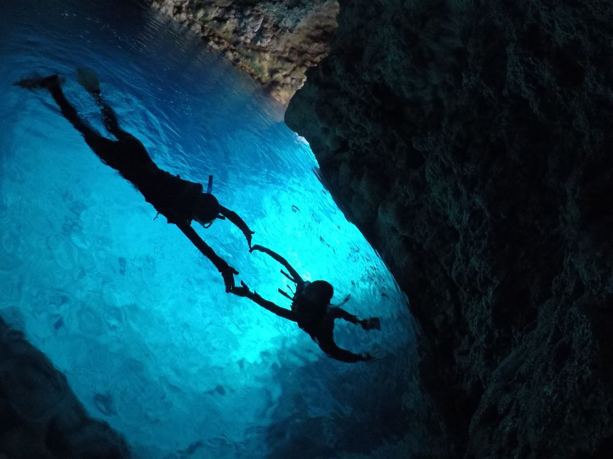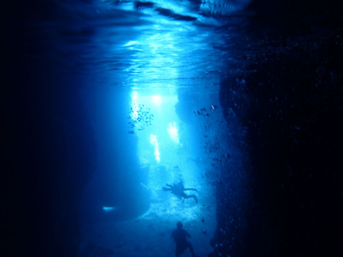洞窟ではシュノーケリング組が海面をプカプカ,ダイビング組が海底を潜って,見ていて楽しかったです。