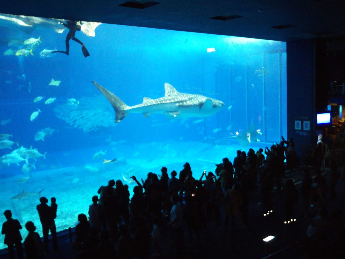 美ら海水族館で、人気のジンベエザメと、