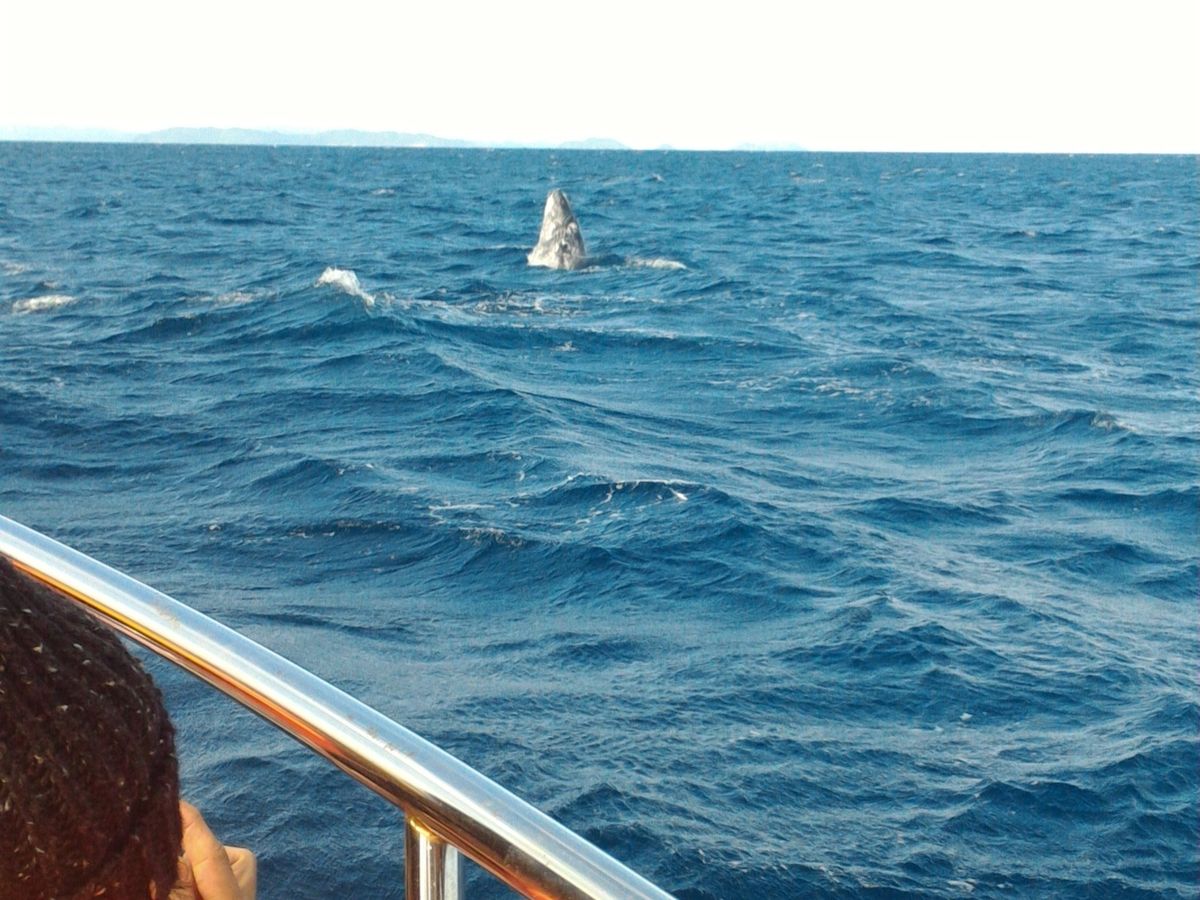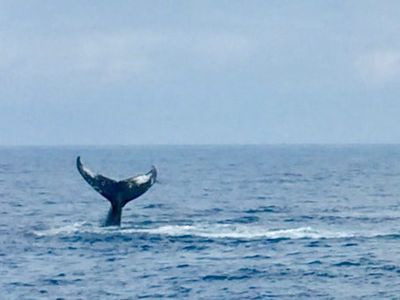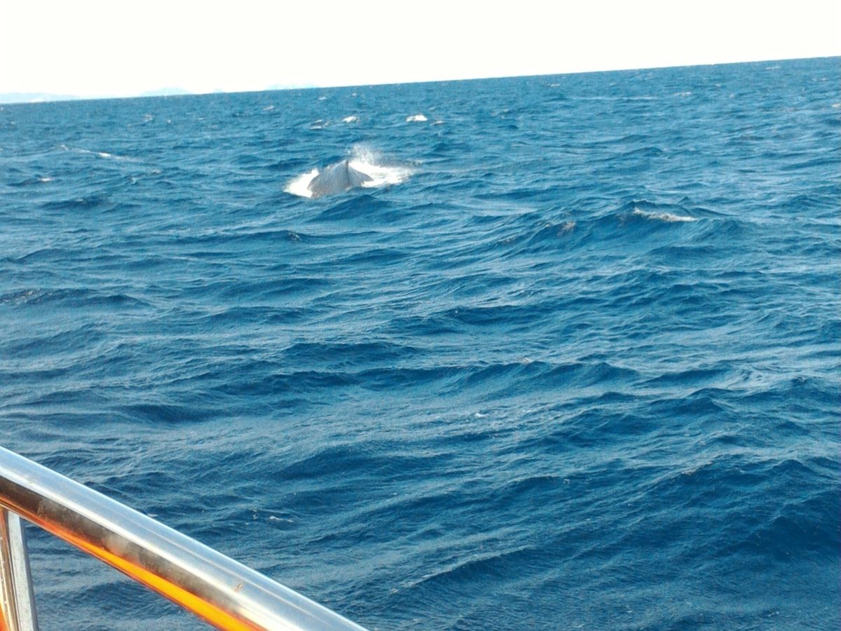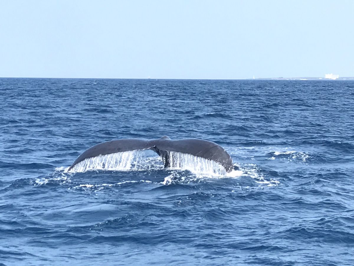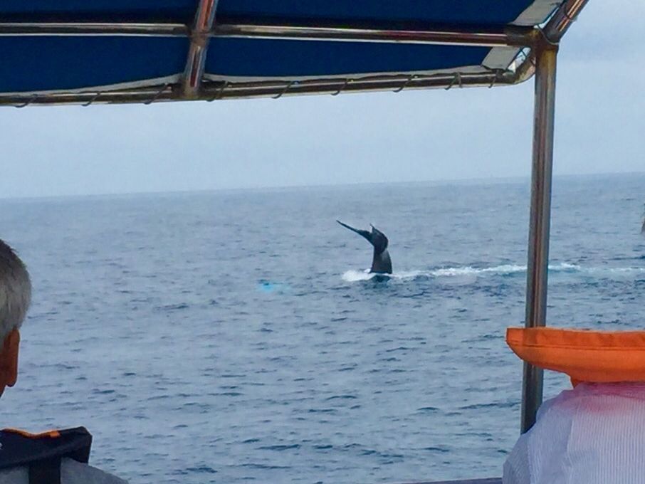 自然相手なので、すぐ見つからないかもしれないし、あまり見れないかも…と思ってたいましたが、この日は運よくすぐに親子+一匹のクジラが見つかりました。たまたま子クジラのジャンプの練習中だったみたいで、(ジャンプは10回沖に出て1回みれるか位らしい)ジャンプを子クジラ4回、親クジラ1回見れました。ブロー、胸ビレ、尾びれもいっぱい見せてくれました。