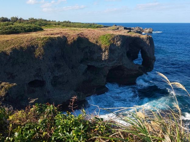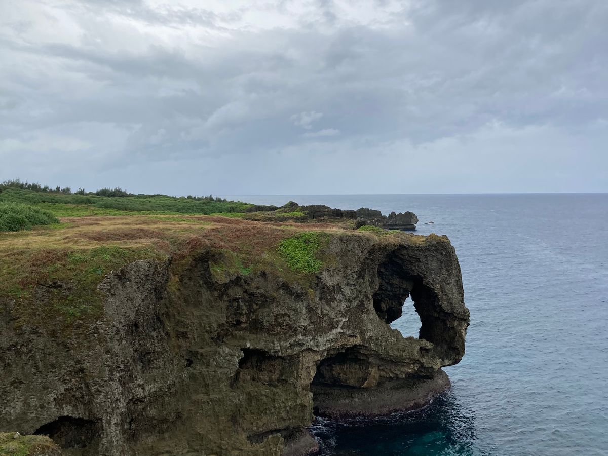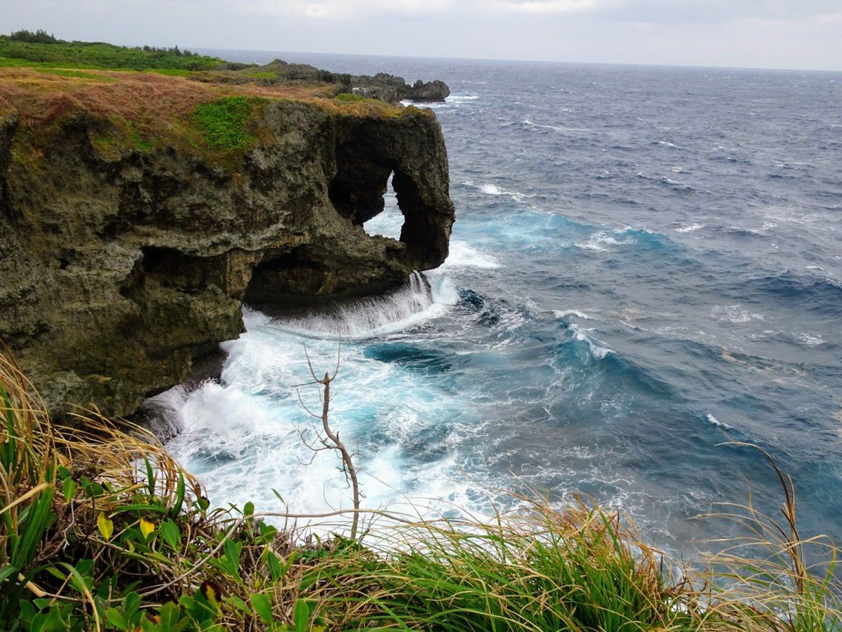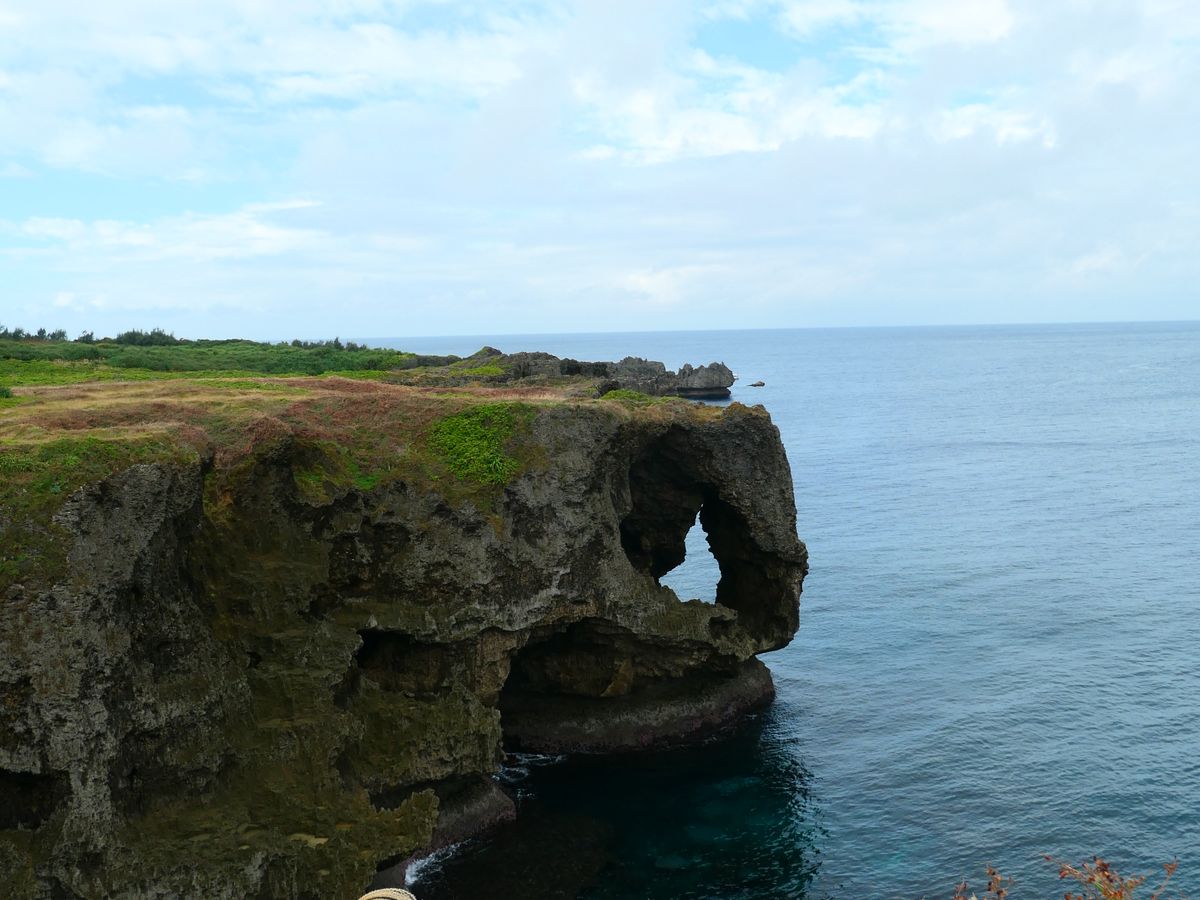 まずは万座毛・・・圧巻です。風が強く帽子が飛ばされそうになりましたが・・・(笑)日傘は役立ちません!