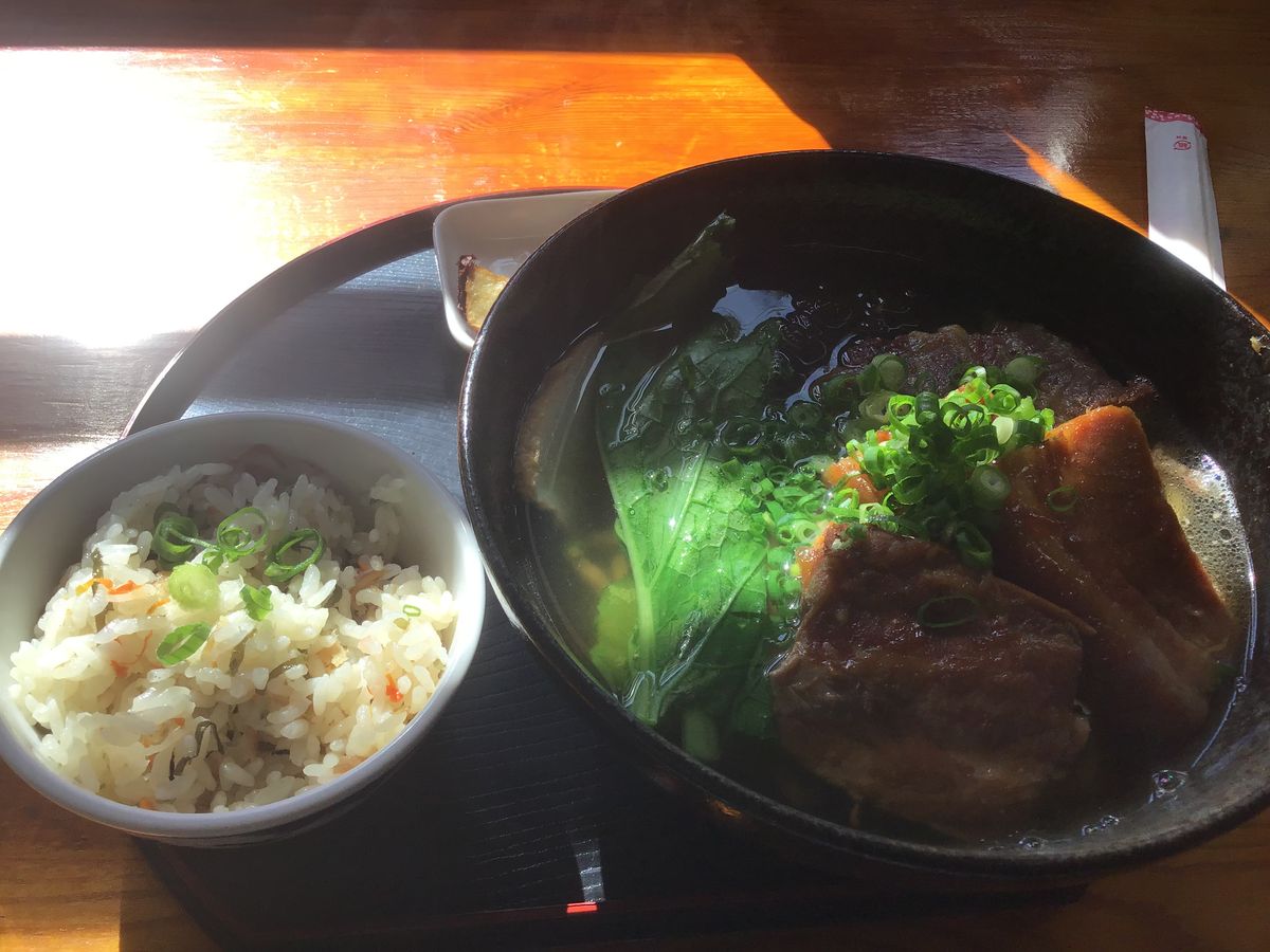 バスでオカシゴテンの停留所の前に沖縄そばを事前に注文するオプションがありましたが、他の選択肢を見たかったので注文しませんでした。到着すると、事前に注文した食べ物がテーブルに用意されていました。この停留所には35分しかなく、レストランが混んでいたため、食べ物を注文することは避けました。