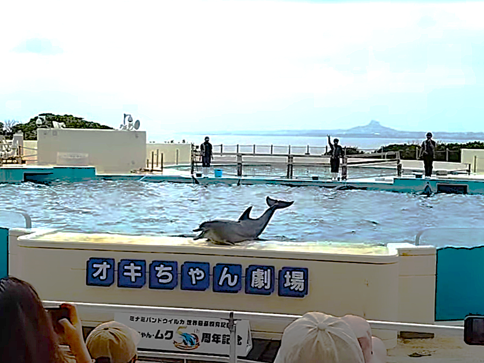 イルカショーは水族館ではなく、公園の別施設で開催。「沖縄民謡、かかるかな?」と思っていたら、まさかの『ハイサイおじさん』でイルカたちがリズムよく“テールウォーキング”!会場が一気に盛り上がり、笑いと拍手に包まれました。子どもも大人も、気づけば笑顔。背景の伊江島まで絶景のおまけ付き。