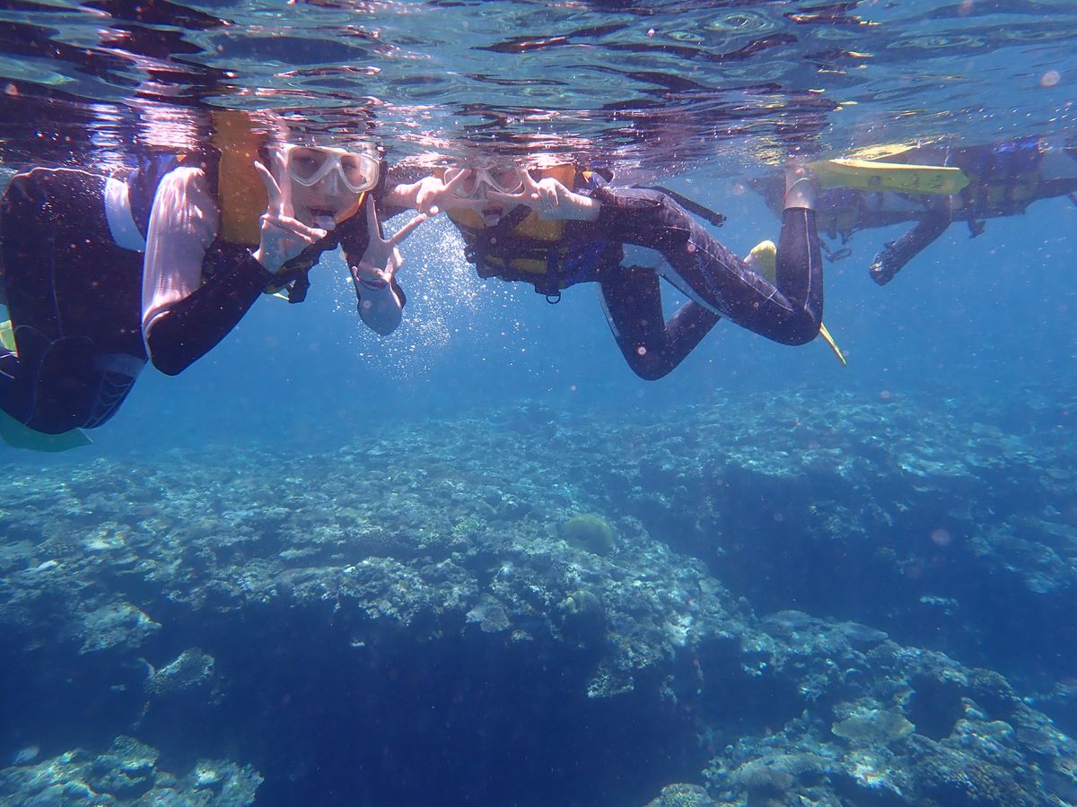 スノーケリング時は水着でもOKですが、ライフジャケットは皆さまご着用いただいてます。
