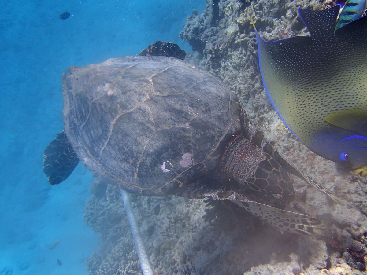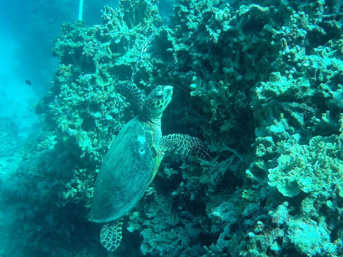 ラッキーなことに、ウミガメが海の底で寝てたのでじっくり観察できました。