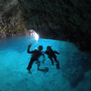 ビーチインのシュノーケリングツアーに参加。スタッフの方も明るく元気で楽しく非常に良い体験をすることができました。混雑してる場合の対応を予め説明いただきましたが、タイミングよく無事洞窟内に行くことができ、本当に美しい青色を堪能することができました。行き帰りの道中も楽しいおしゃべりで盛り上げていただき、教えていただいたタコライスとマンゴーのかき氷は絶品でした。次はボートインの体験スキューバですね。素敵な写真もありがとうございました。