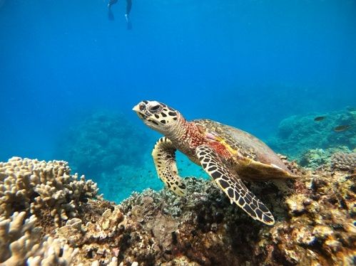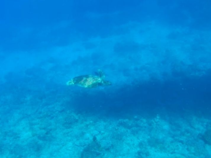 シュノーケリングは、午前と午後で場所が変わると、海の様子も変わります。ウミガメにも2匹会うことがてきました。