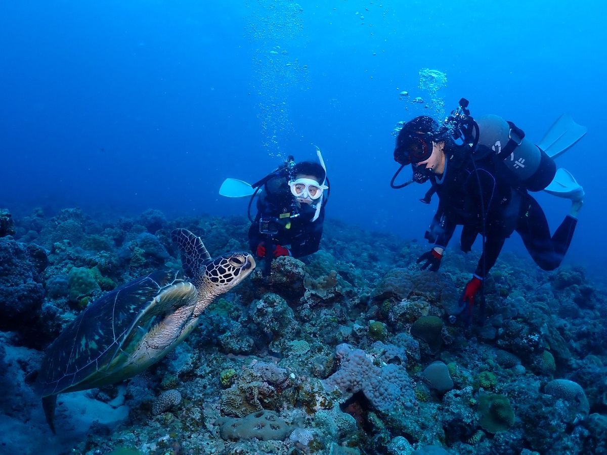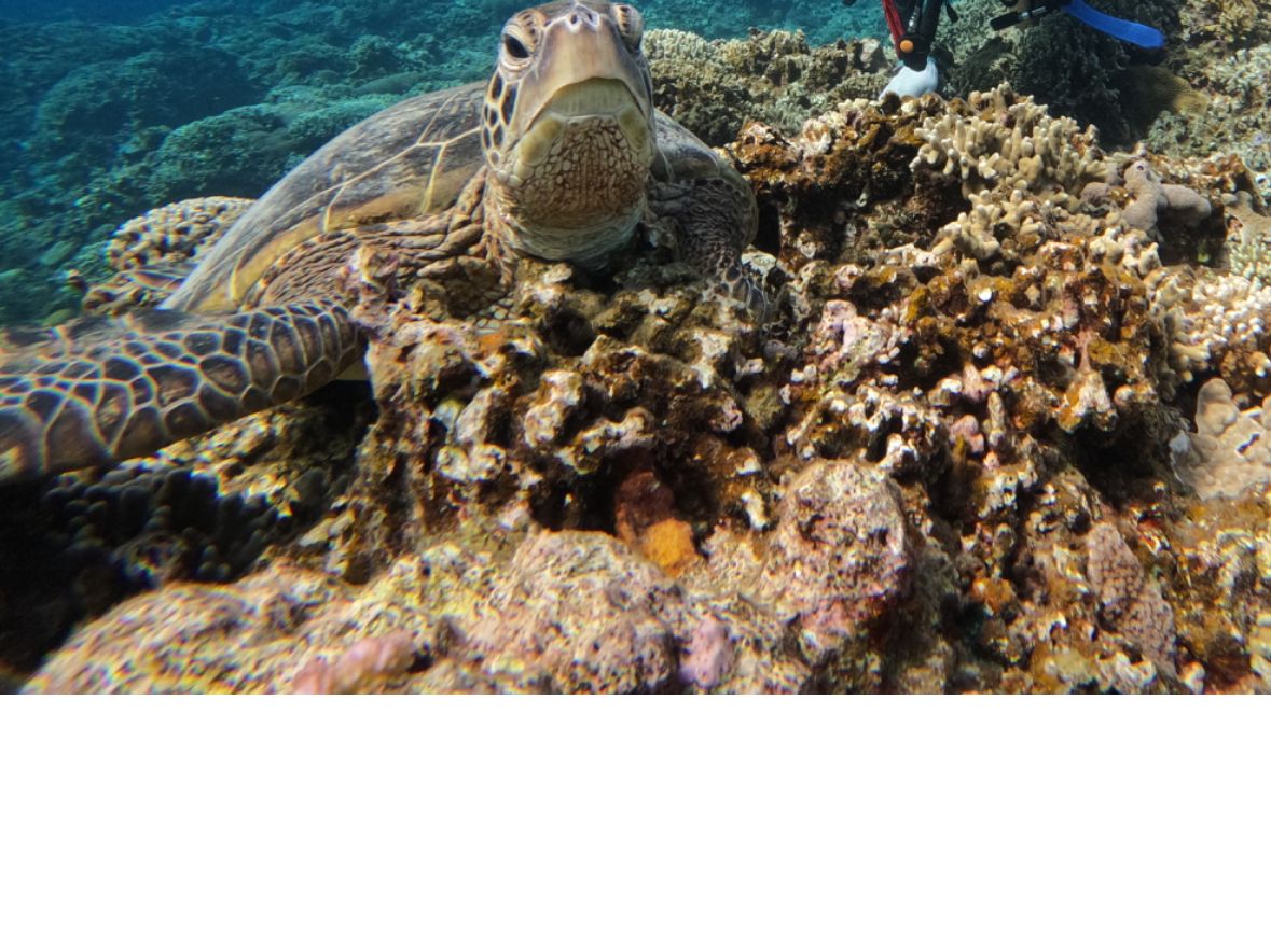 天候の関係で残念ながら慶良間までは行けず、手前の島でダイビングすることになり、透明度も普段よりはそんなに良くないとのことでしたが、アカウミガメとアオウミガメ、どちらにも出会うことができ、とても楽しかったです。