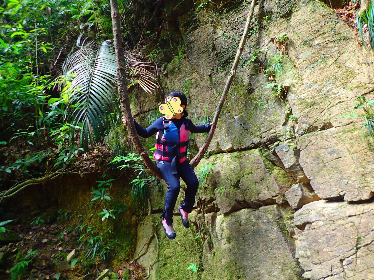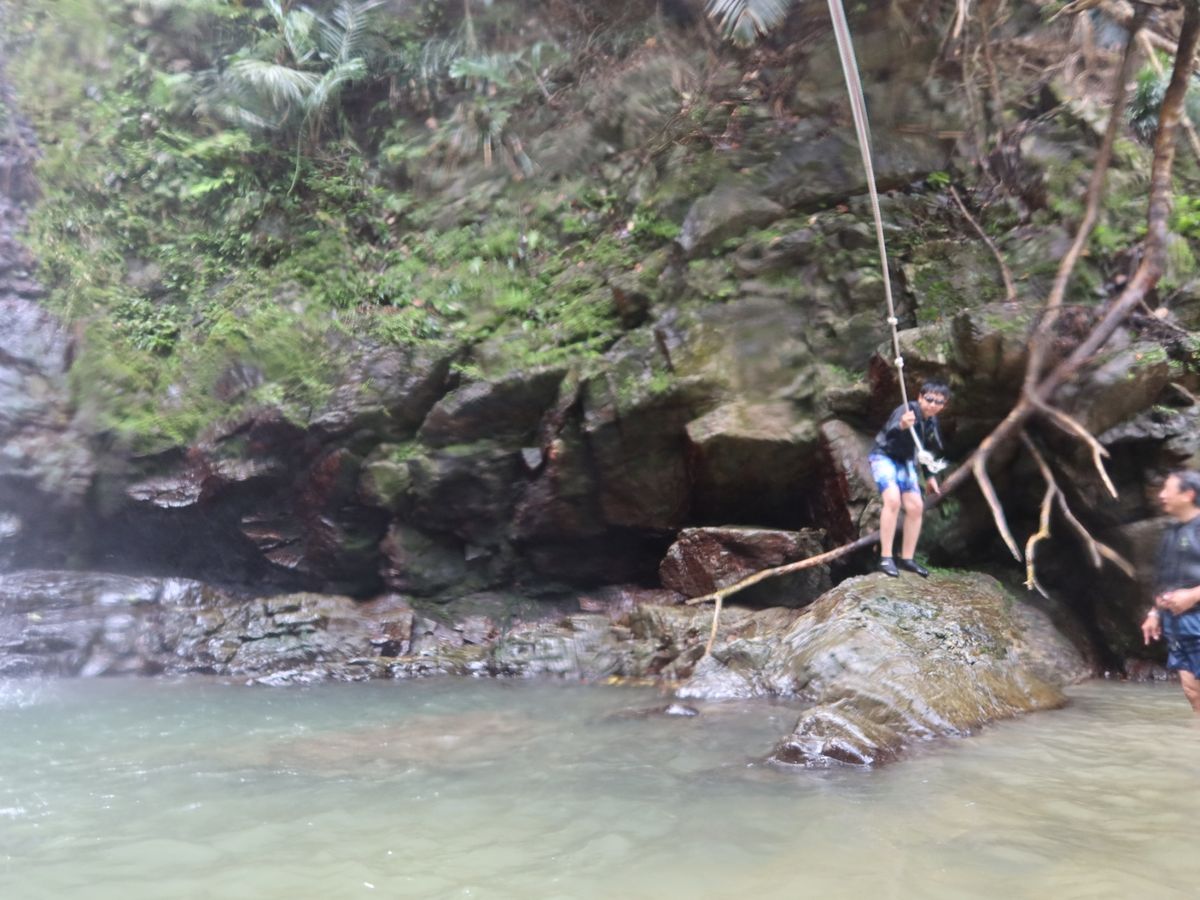 途中岩場を登ったり、たくさんの生き物見たり、ツルでできたブランコなどで遊びながら目的地のター滝を目指します。ター滝では滝修行のように滝の中に入ったり、ターザンのように高い木から滝壺へダイブされている方もいらっしゃいました。