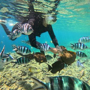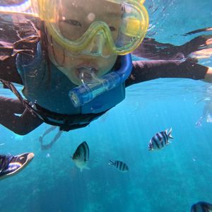 海の中は想像以上に綺麗!魚は逃げないむしろ寄ってくる!入水してからは妻はシュノーケルが口呼吸しかできないため慣れなくて手こずってました。