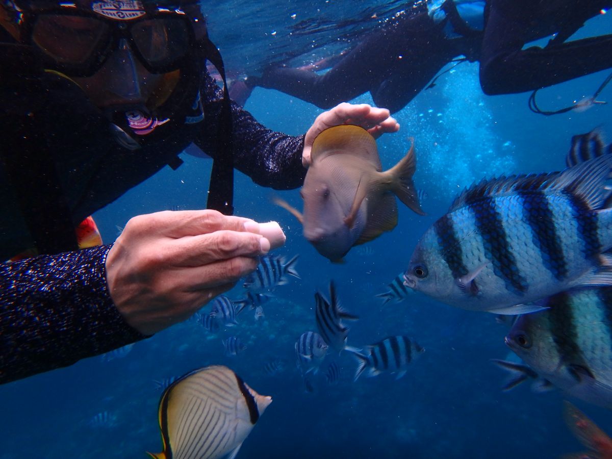 想像以上に綺麗な魚たちがたくさん寄ってきてくれて、思わず歳も忘れて夢中になるほどでした(笑)。