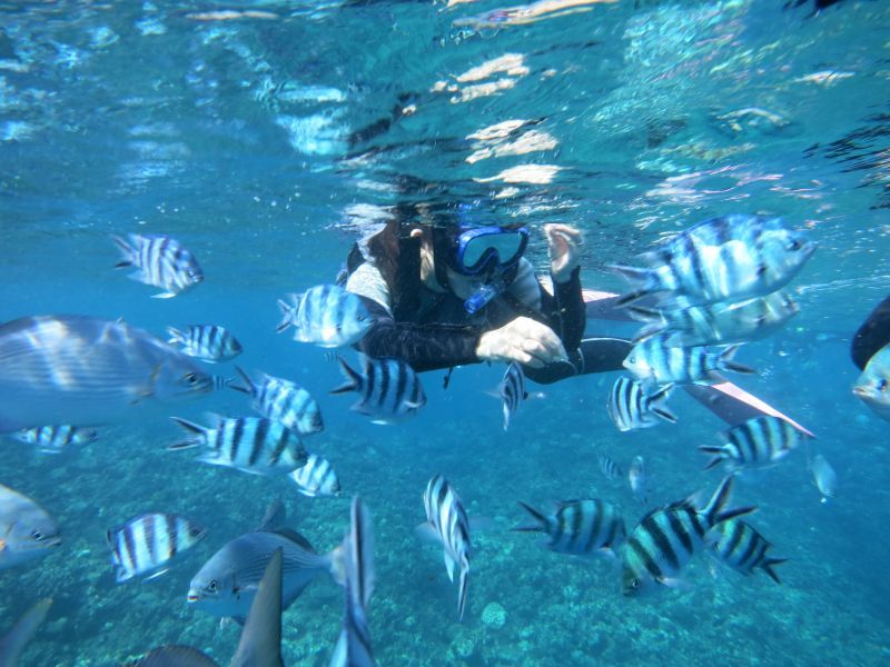予想以上に魚がたくさん居て綺麗な海の中の景色が見れました。反面、予想通りと言うか、これも予想以上なのか、びっくりするくらい人混みが凄くて、フィンで他の人に蹴られたり、ダイビングで参加の人は、海底でシュノーケルの人の下に居たりして、一斉にバブルを発生させるので、視界が泡ぶくだらけになり、望みもしない下からの泡に驚くのと、何か嫌な感じがするので、ダイバーとシュノーケルのとタイミングをずらして欲しいです。
