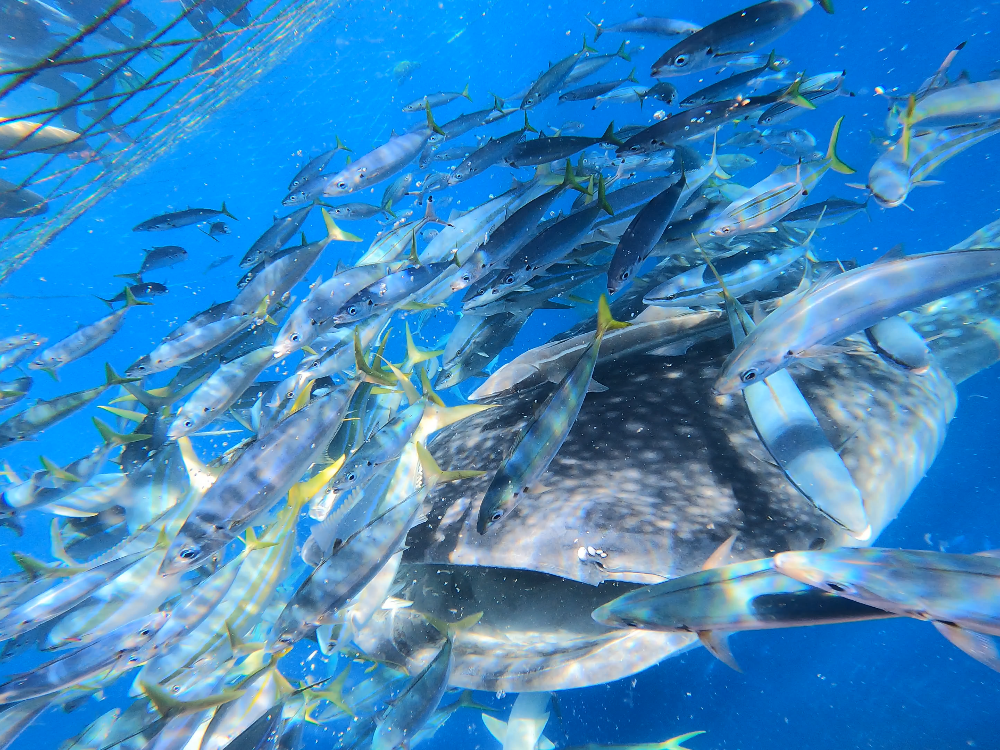 手が届きそうなほど近くを泳いでくれました。お口の中までみえましたよ😊ジンベイザメの周りにお魚もたくさん!