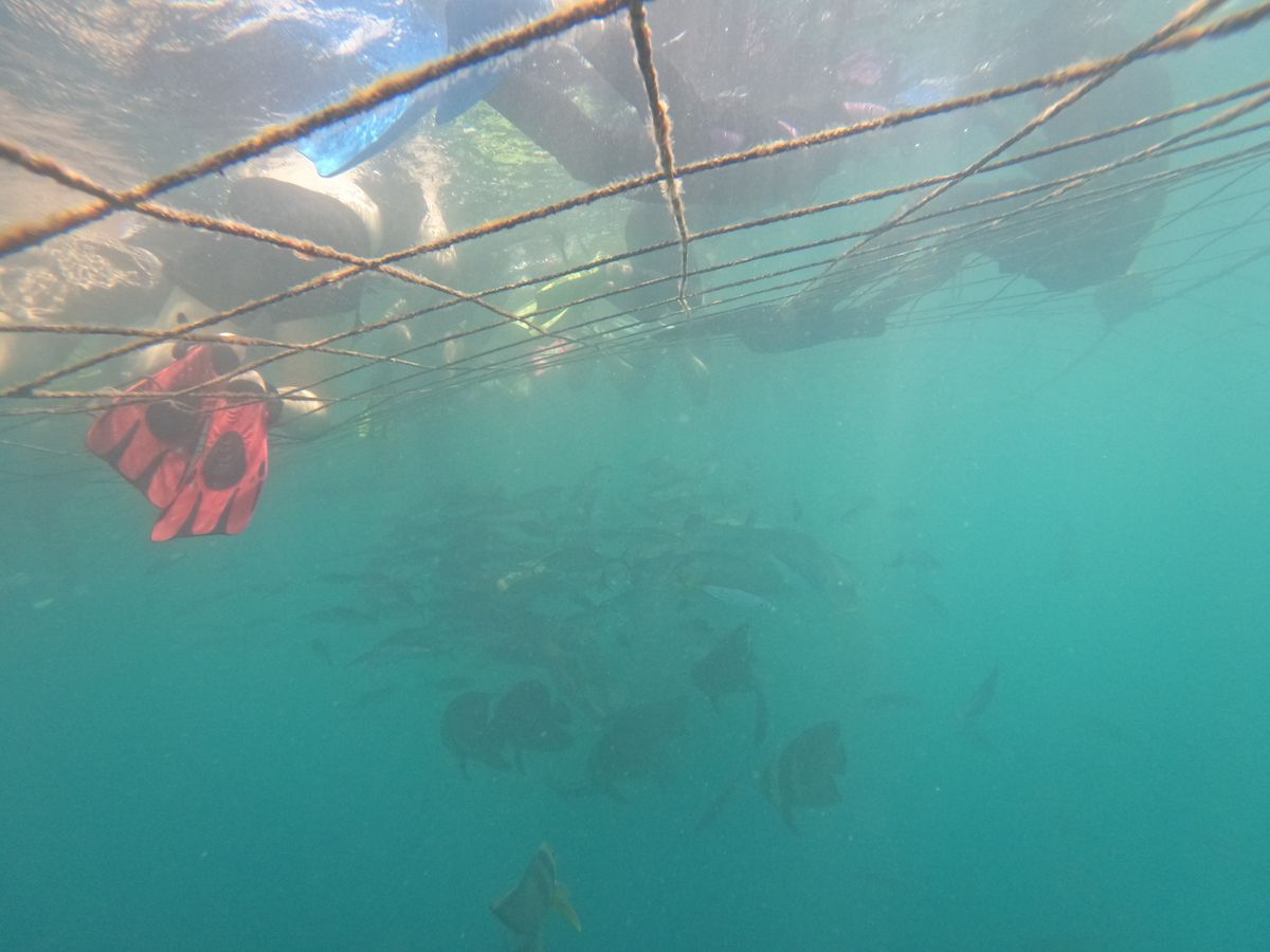 ジンベイザメの餌やリのときには たくさんの魚が寄ってきます
