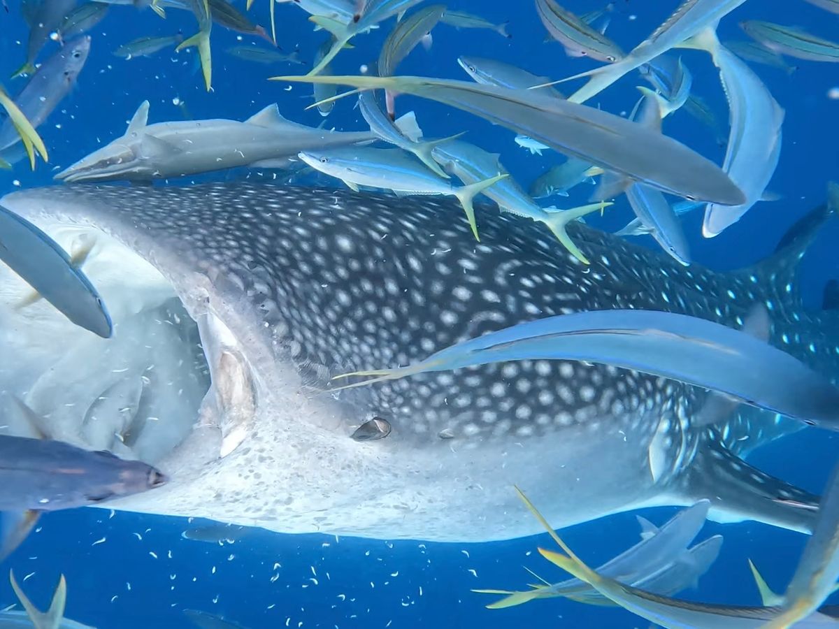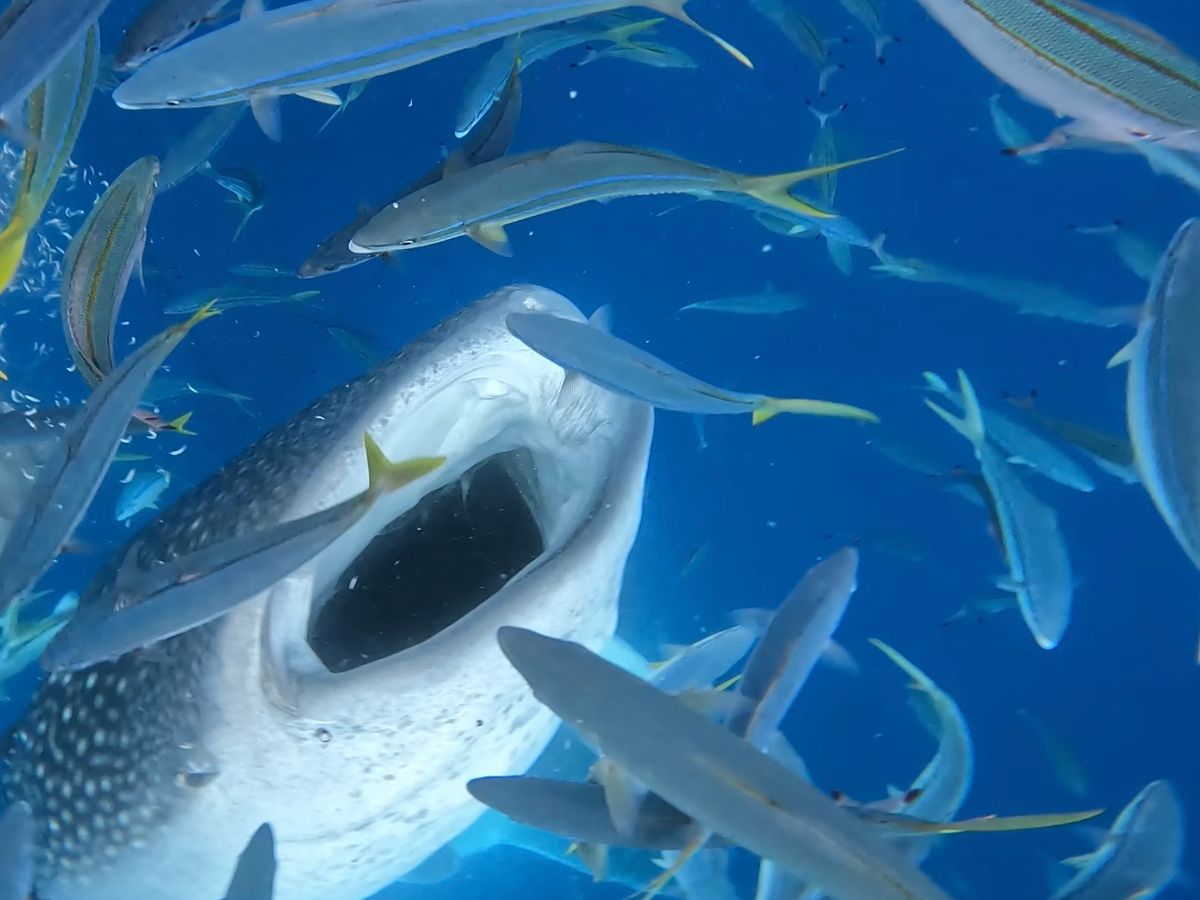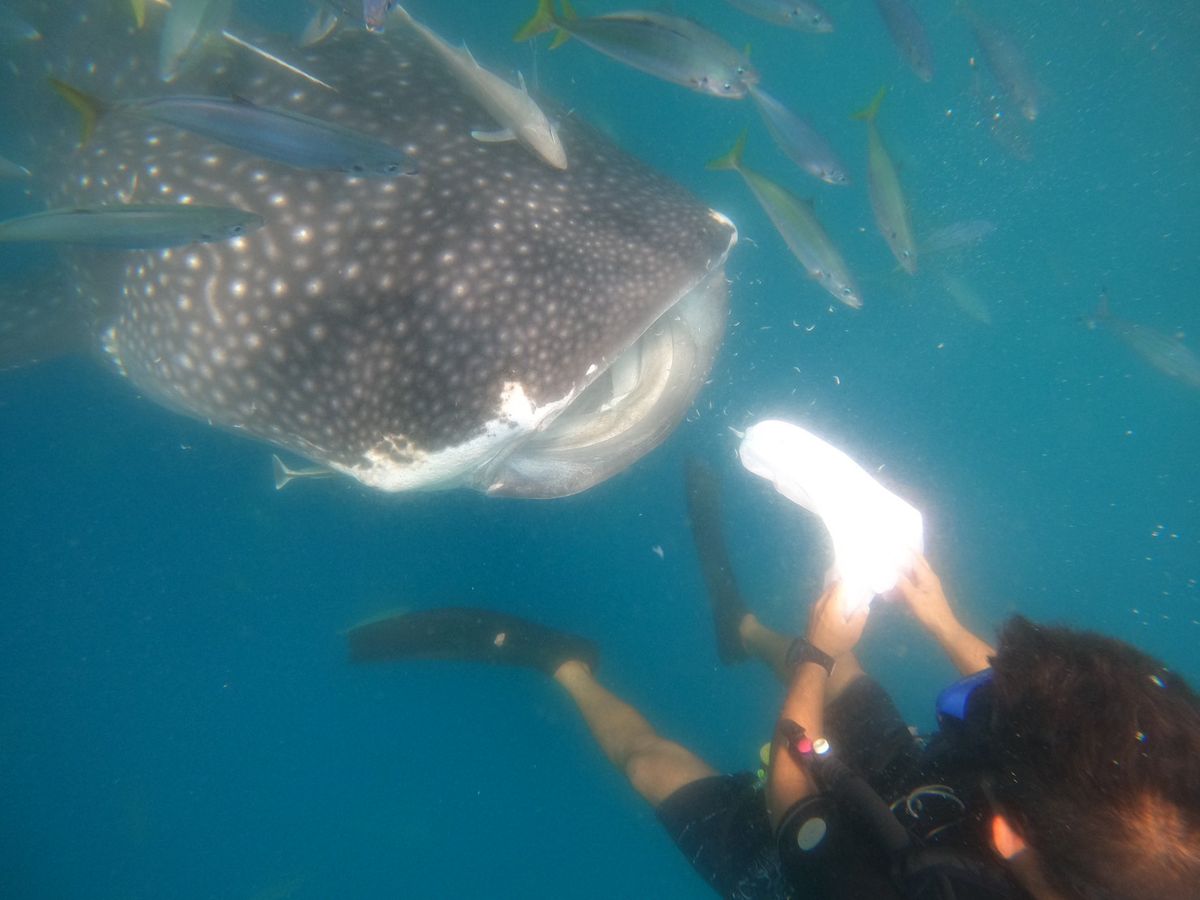 ボートから海に入るとすぐに手が届きそうな近さにジンベイザメが2匹泳いで来ました。 自分のカメラではレンズに頭しか収まらない大きさでした。 シュノーケリングでも十分に餌を食べる様子を観察することができました。 動画や写真もたくさん撮って頂きました。