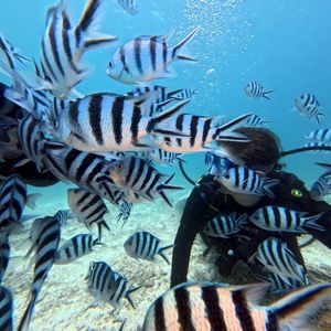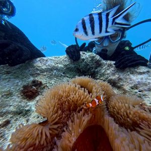 56歳一人参加。前夜、緊張で寝不足の中、酔い止め内服も初体験。不安の中、スタッフの確認電話や声掛けのおかけで気持ちが軽くなりました。透明度抜群の海に感動!カラフル珊瑚と魚達に魅了され、最高の体験でした!
