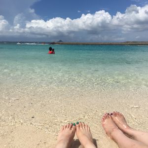 水納島では最初にシュノーケリングを体験させてもらいました。インストラクターについていくように泳ぎ、ポイントでは魚に餌付けをさせてもらい、写真を撮っていただきました。時間にすると50分くらいです。その後は一度水納島に上陸し、30分くらい休憩した後、再度船に乗りパラセーリング体験をさせてもらいました。私たちのほかに1組いたため、順番でパラセーリングを行います。時間では1組15分くらいかと思います。こちらでも写真をとってもらいとても良かったです。その後、再度水納島に戻り、自由時間で昼食をとった後、ダイビングの体験を50分程度行い、ツアーが終了となります。