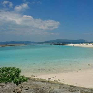青い海と水納島の白い砂浜、遠くに見える地平線。