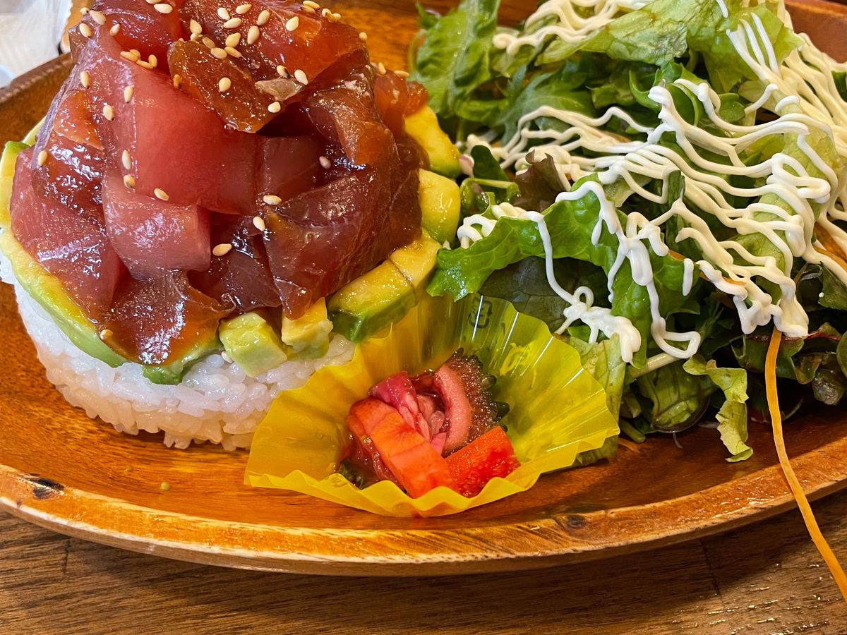 ランチは海ぶどうをたくさん食べたくて海鮮丼を選択。正直美味しいのは肉の方です。パパイヤ?の漬物も食べられた。
