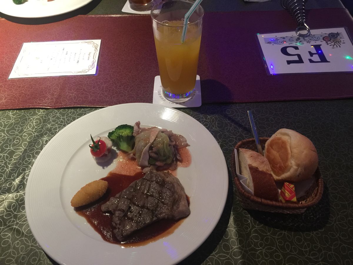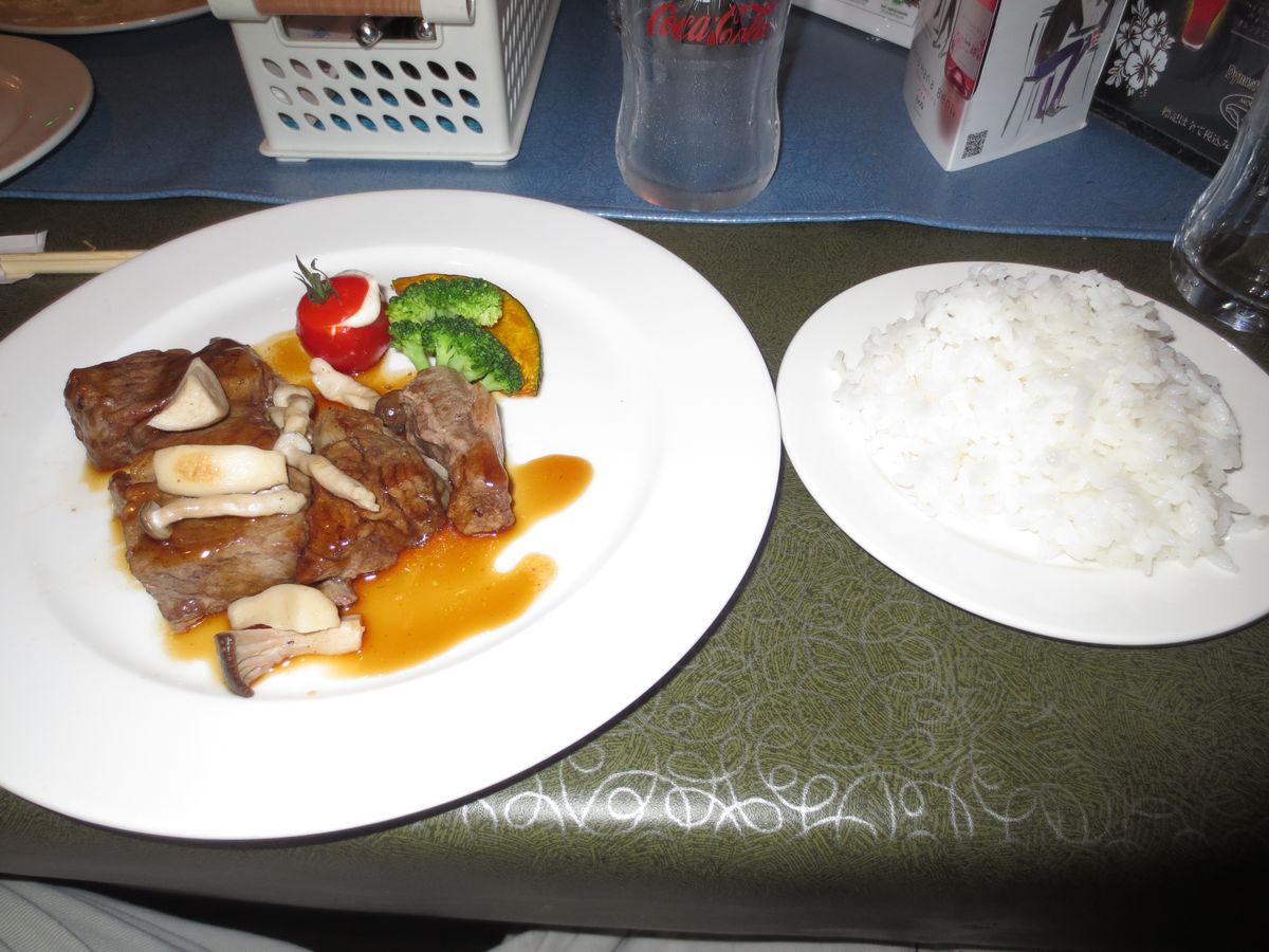 食事のステーキはまずくてかたくて食えない。焼き方も希望を聞きに来ないで、well done