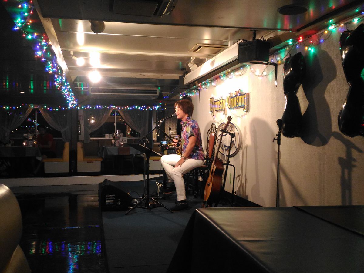 サンセットクルーズという表題でしたが、あいにく曇り空。よって日没は見ることはできなかった。しかし、船内でミュージシャンが生歌を披露してくれていたので、窓辺の席でしたが、外を眺めることのクルーズタイムよりも2回のプレイタイムは楽しかった。