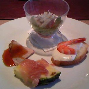 料理は、アミューズ、前菜、魚介、肉、デザートの内容ですが、プラス、ブュッフェスタイルのサラダバーらしき物とスープ2種類。