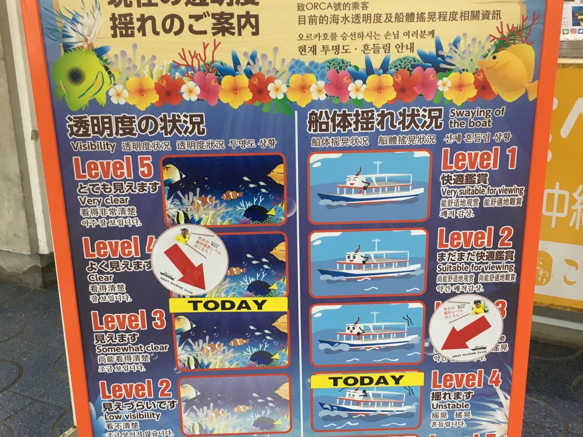 乗船する前に、本日の揺れ具合、透明度の説明があります。揺れ具合は確か4段階に分かれていたと思います。私が乗船した日は、「揺れます」レベルでしたが、それほど大きな揺れではありませんでした。透明度のレベルも4段階に分かれていたと思います。私が乗船した日は「少し濁っています」レベルでしたが、お魚もサンゴ礁も良く見え、とても良かったです。