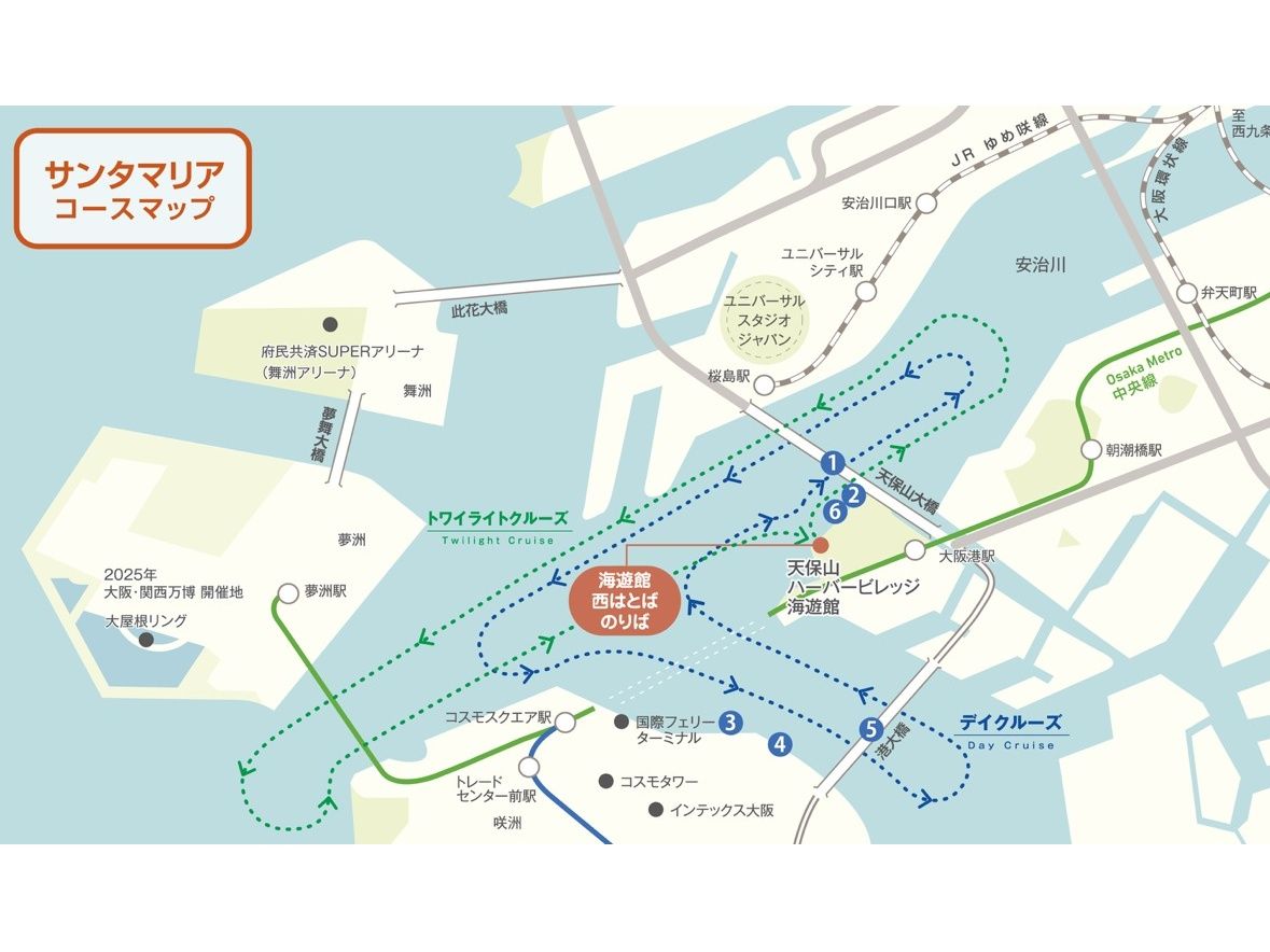 新大陸に到達したコロンブスの旗艦[サンタマリア号]をモチーフに作られた観光船「サンタマリア」で、大阪港周遊の旅へいざ出航!天保山ハーバービレッジ・海遊館から出発し、大阪港の美しい景色を45分間の観光クルーズでお楽しみいただけます。