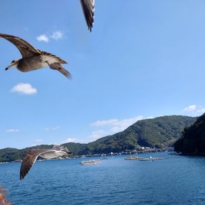伊根湾の遊覧船では、観光客が鳥に向かって投げるエサを目当てに、大量のトンビ?が群れをなしてやってくるので、びっくりしました。