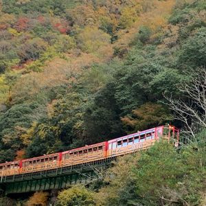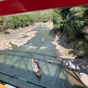 一般の人は長い列でしたが、トロッコ列車に待たずにスイスイ乗れました。川下りは水の音が心地よく、鳥や亀と自然を近く感じ、紅葉が良かったです。時々早くなる激流や水しぶきがアドベンチャー感がありました。