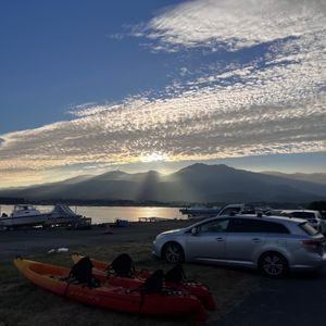 周りが山に囲まれているため、早めに太陽が山に隠れてしまいましたが、空は綺麗に赤く染まり、湖面もキラキラと輝いて見えました。太陽が隠れるのが早いため、涼しさを感じながら楽しむことができました。
