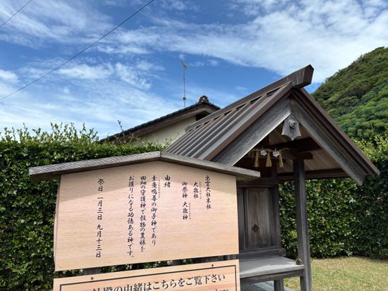 【ご祭神】素戔嗚尊の御子神の五穀の守護神で穀物の豊穣をお護りになる功徳のある神