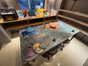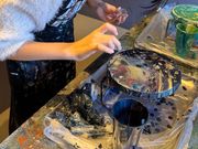 小学四年の娘を連れて、家族で体験しました。インクを調合して混ぜ合わせ、イメージに合う色をつくる最初の過程からもう楽しかったです。 つくりたい色をイメージするということ自体が普段やらないことなので、できるか?と不安も少しありましたが、やりだしたら2時間ほどの体験時間があっという間に過ぎるくらい没頭してました。 イメージして色を作ったものの、いざキャンバスに流したら思うようにはならなくて、それもまた面