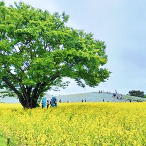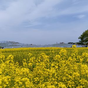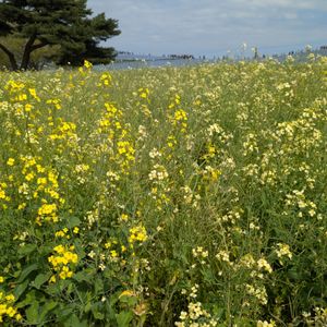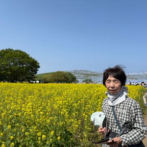 丘から降りたところにある菜の花畑も結構見ごろで、ブルーと黄色のコントラストもきれいでした。