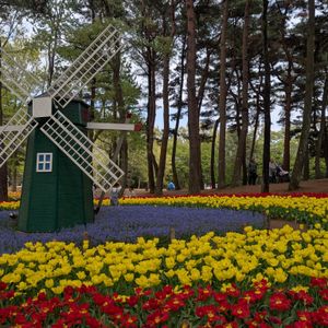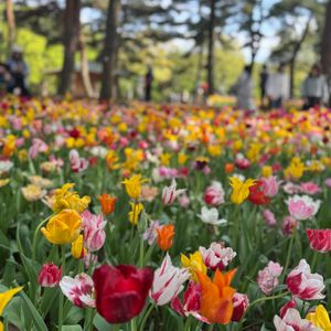 また、その日はチューリップも見ごろで、オランダのキューケンホフ公園の造園にも携わった方の協力で作られたチューリップ庭園では、色とりどりの品種が違う花々にうっとりしました。犬を連れた方々も多くいらっしゃり、中にはピンクのドレスに飾られた犬とチューリップの撮影をされている方も、、、。癒されました。