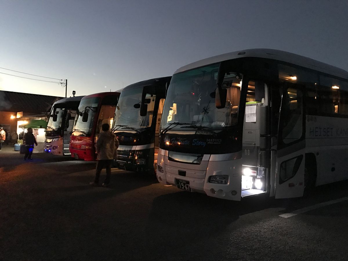 大石公園5:00着 外はまだ暗く星空がとても綺麗。日の出までバスで待機 仮眠。日の出予想6:30頃