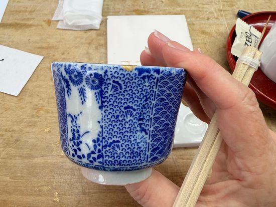 江戸時代の陶器を修復する興奮は言葉では表現しきれません。ヨシコ・クゲさんは、私たちを優しくプロセスに導いてくれました(ペイストリーとお茶で迎えてくれた後に)。