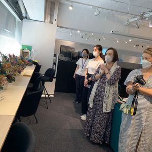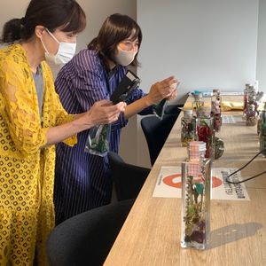 最後には参加者全員の作品を並べて、鑑賞会と写真撮影。同じお花を使っているのに、どれひとつ似た作品はなく、個性が溢れ、どれも素敵な作品でした。参加者同士、和気藹々としたとても楽しい時間を過ごすことができました。