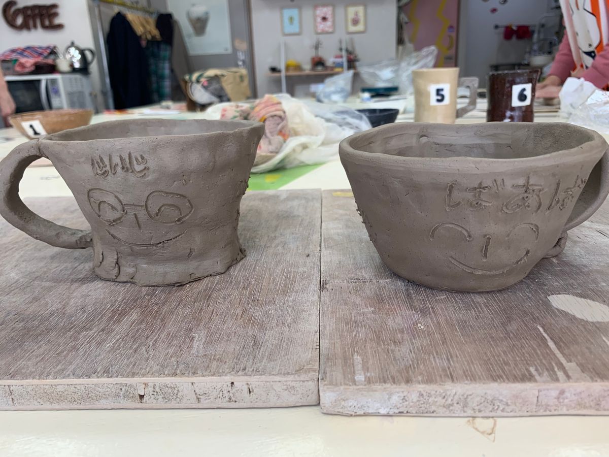 じいじとばあばと結婚記念日祝いのマグカップを手びねりで作りました。お手本のカップよりかなりボリューミィなカップが完成しましたが、先生が優しくわかりやすく丁寧に教えてくださったので、息子も私も大満足です。