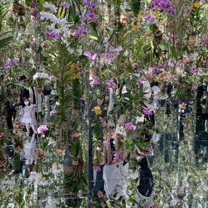 カラフルに光り輝く暖簾のようなLEDに身を置き、天井に浮遊する華麗な花々と蝶々を見上げ、温かい足湯のような感じのウォーターエリアの水面を泳ぐ錦鯉や鮮やかな花に触れ、滴り落ちるしずくを掌で受け止め、生花の蘭に魅了されて、自分が作品と一体化出来たような感覚が一生忘れられない素敵な想い出になりました。