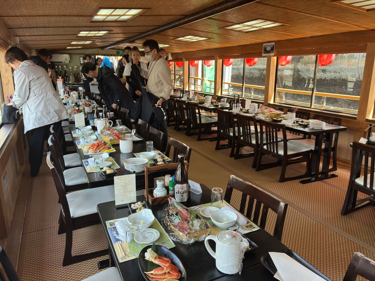 テーブルには予約したコースごとのお造りや料理、瓶ビールが準備されており、出航と同時に飲食が開始されます。