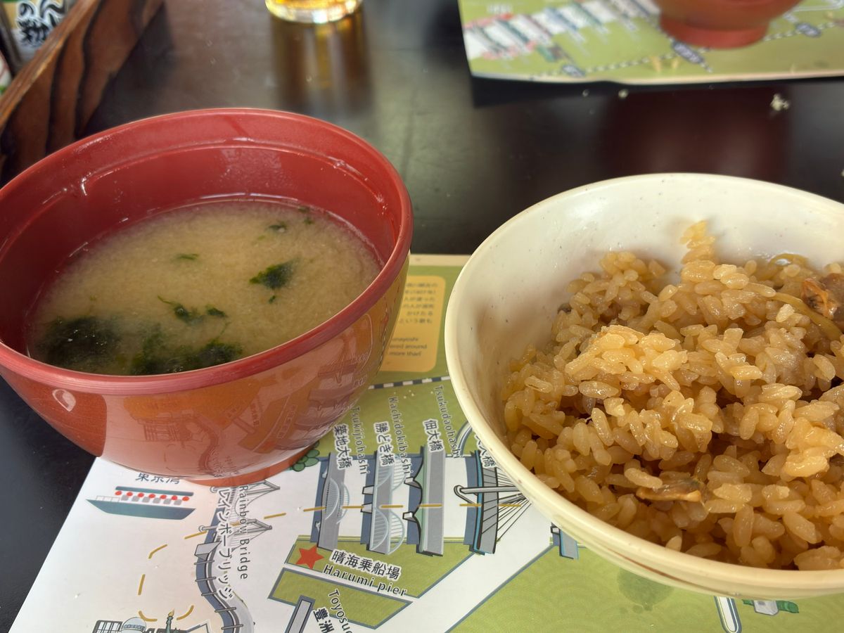 天ぷらの提供が終わると炊き立てのアサリ飯と味噌汁、最後に甘味デザートをいただきました。
